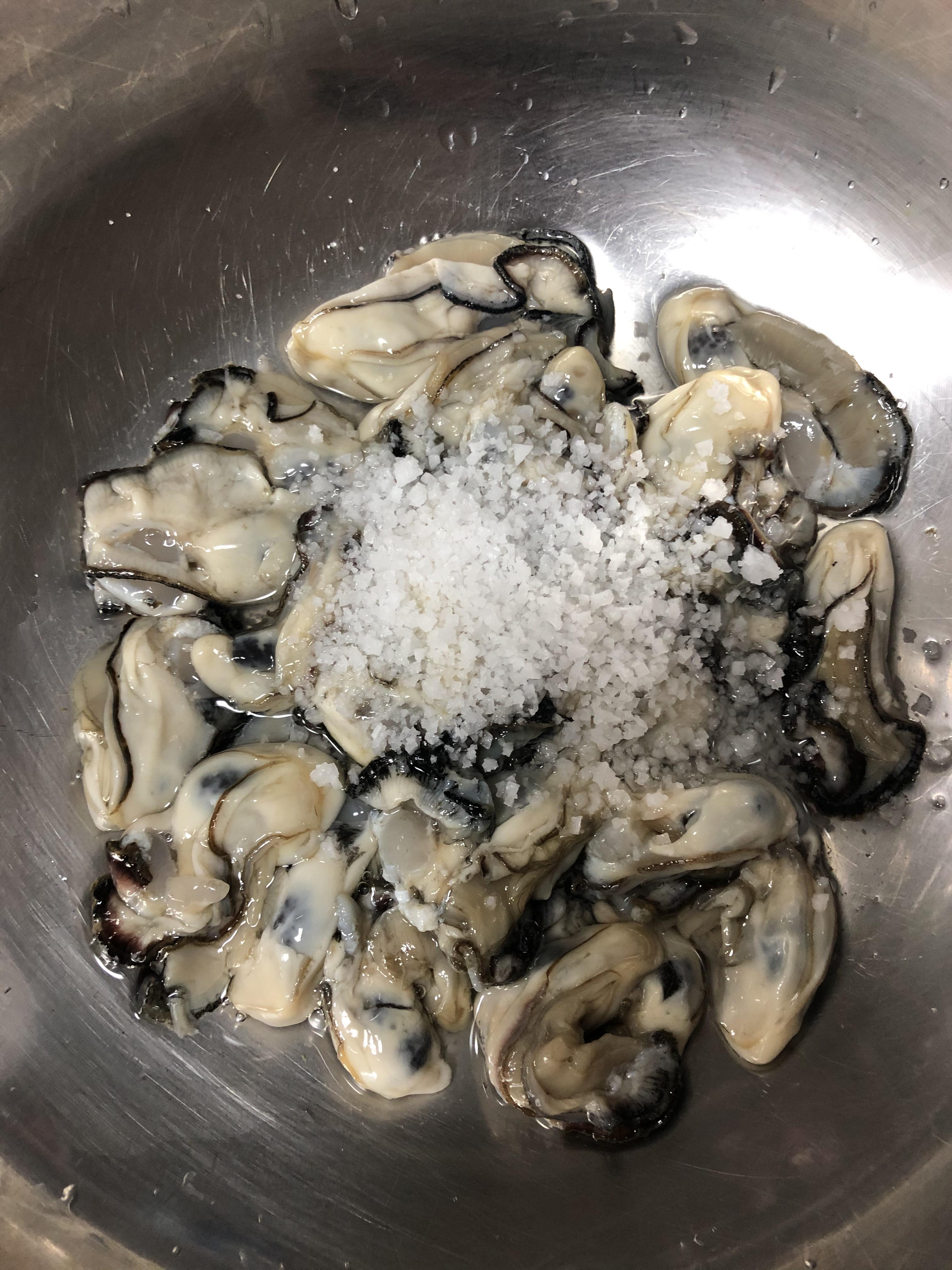 굴은 소금 넣고 손가락으로 살살살 조물조물해주고 물로 두, 세 번 휑궈서 준비해주세요.